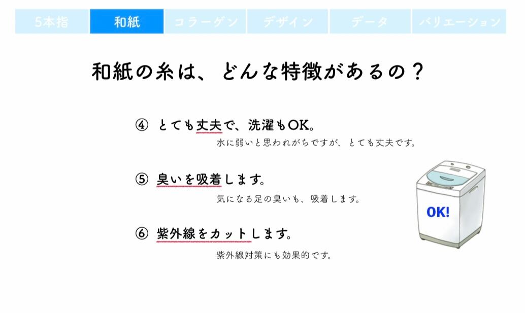 アウターには吸湿性に優れた「紙」を主体にした糸を使い、保湿しながら指の間の不快なムレを劇的に改善しました。