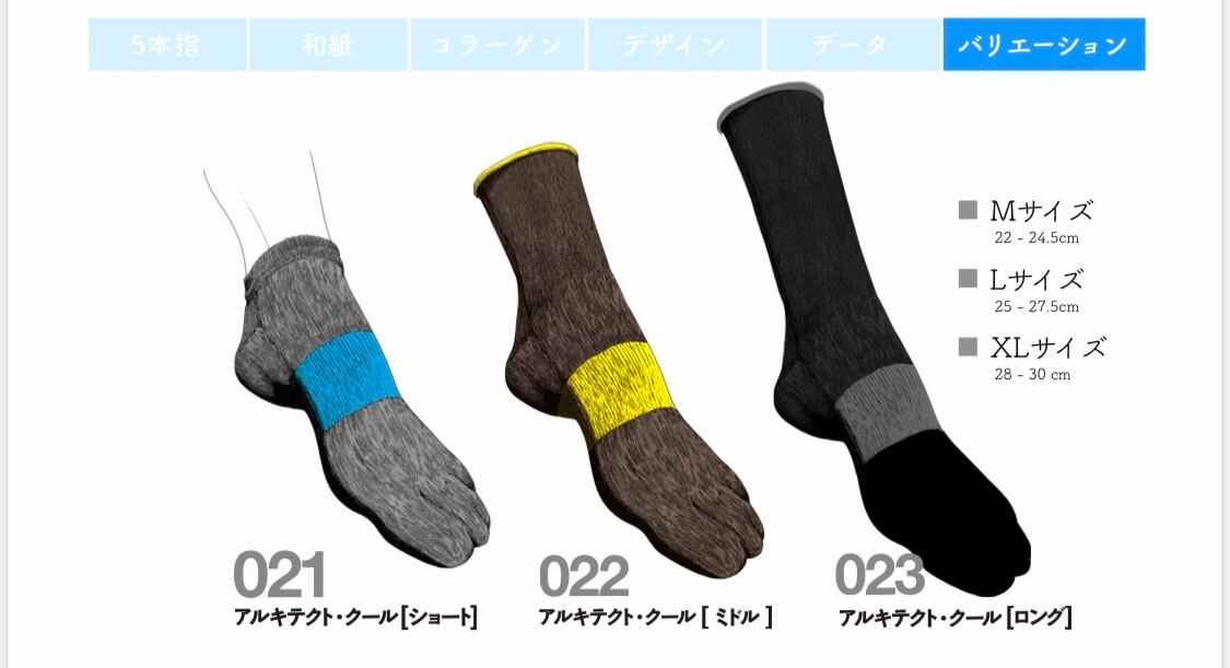 「アルキテクト クール 021 ショート」は、日本で誕生した特許技術を駆使して製造されています。この特許技術は、和紙とコラーゲンを組み合わせた異素材コラボレーションを可能にし、靴下に素足のような履き心地と高い機能性を提供しています。