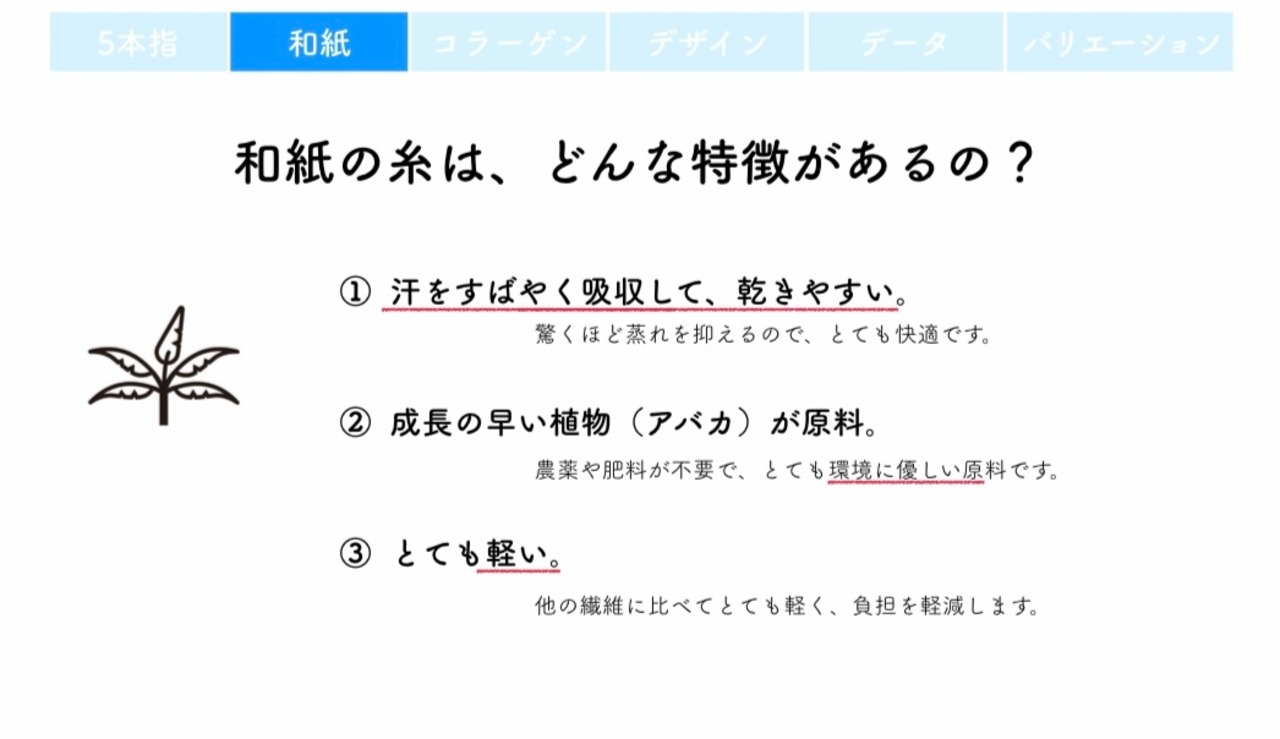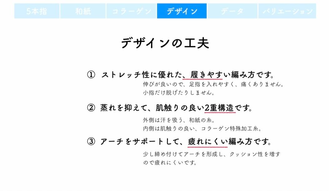 アウターには吸湿性に優れた「紙」を主体にした糸を使い、保湿しながら指の間の不快なムレを劇的に改善しました。